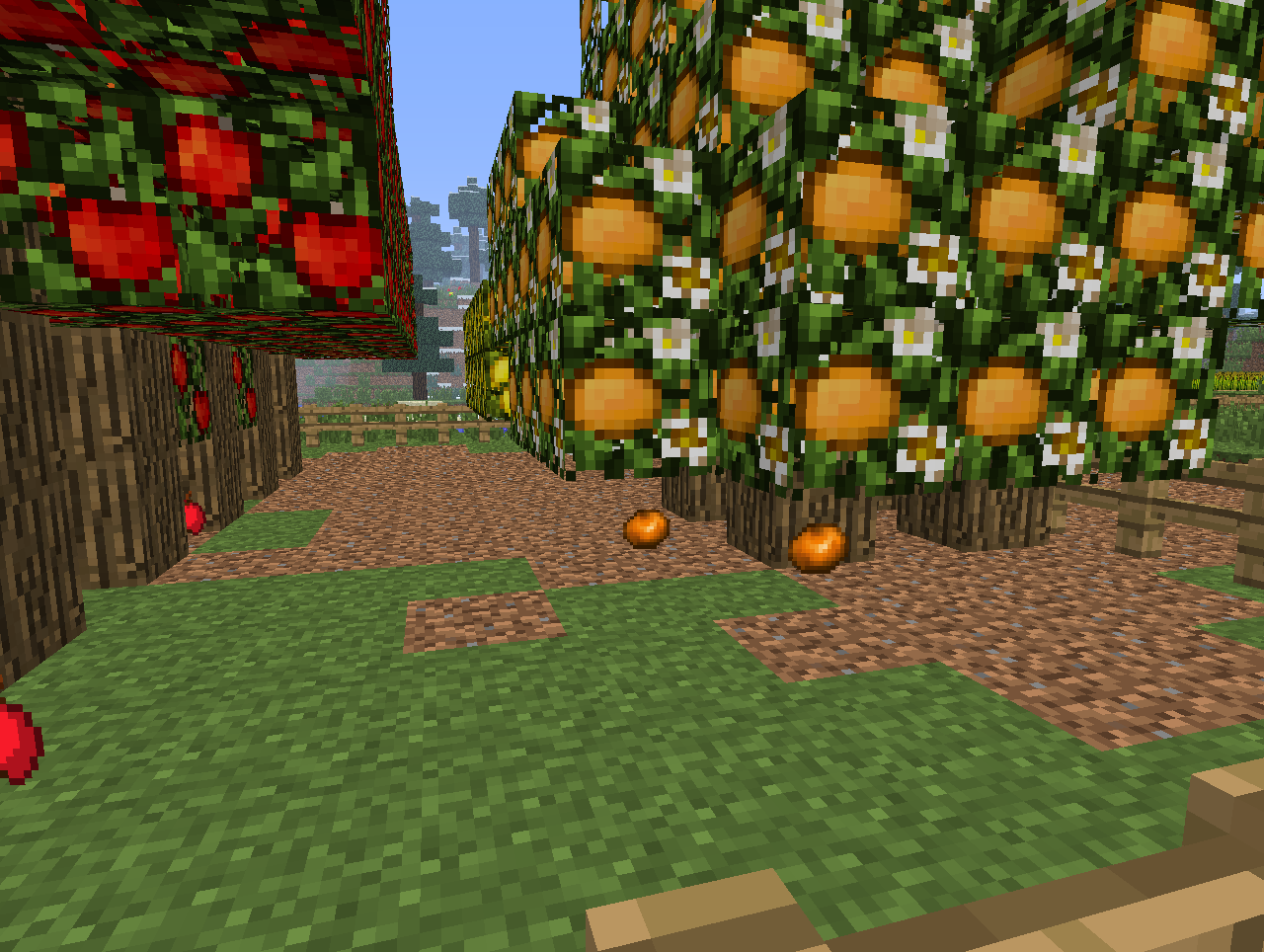 Los arboles frutales como el manzano , naranjo y limonero tiran sus correspondientes frutas al suelo , ademas estos no pueden plantarse uno seguido de otro , tendreis que dejar un espacio de 1 cuadro como veis en la imagen por que si no se produce un BUG.